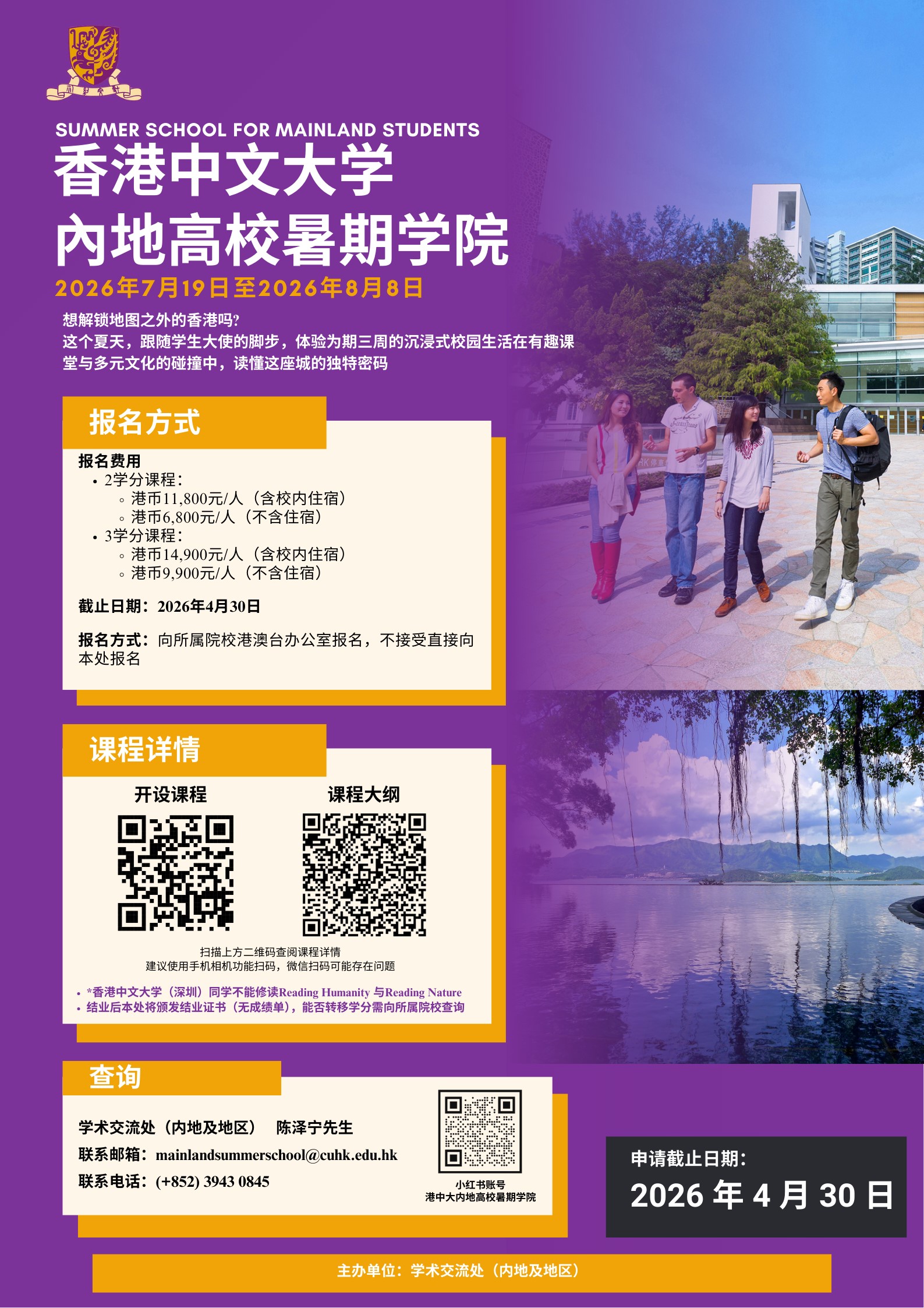 2. 3学分课程:港币14,900元/人(含校内住宿);或港币9,900元/人(不含住宿)。